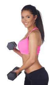 Plyometrics is a term used for short static powerful bursts of activity and is another useful addition to your exercise plan. Below we show five different exercise routines to do 3 times with 10 repetitions each. Do these 2-3 times a week. They will really work your muscles, getting your heart rate up and burning extra calories. Unless you already weight train, we recommend you start these exercises without dumbbells. Introduce them as you progress.